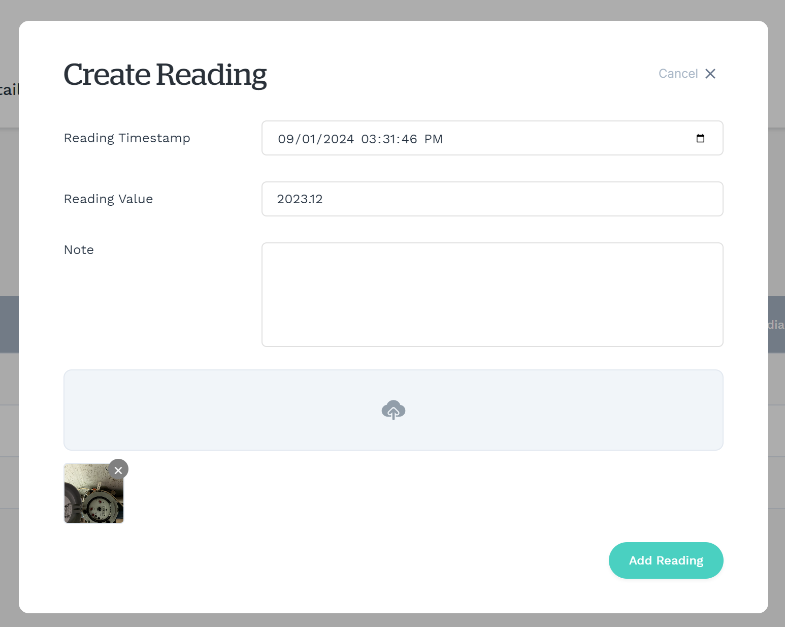 The meter readings tab is where you can add any manual meter readings & relevant images. These reads are used to validate that the logger is functioning as expected.