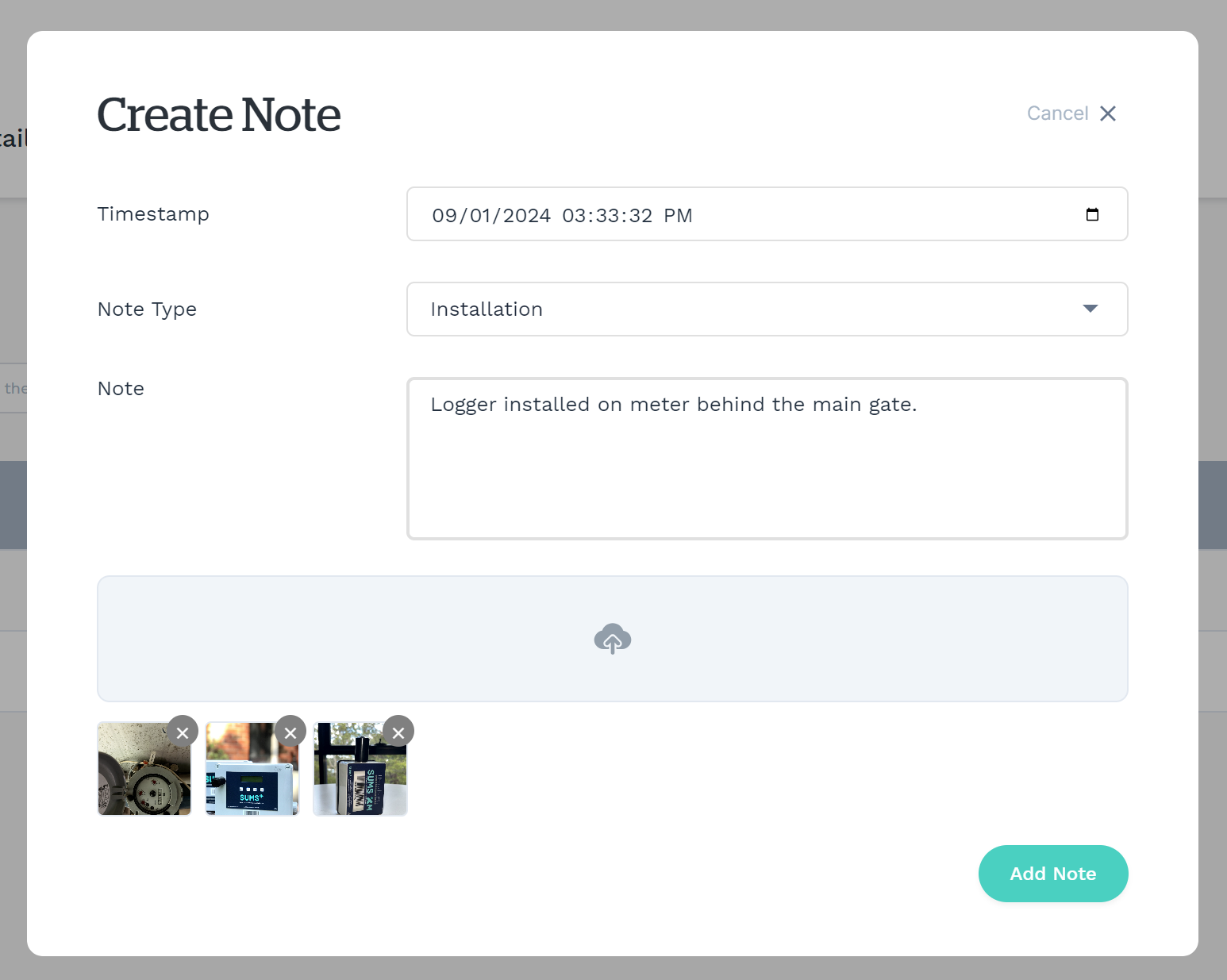 The Meter Notes section is where you can include any notes & images on the logger installation, maintenance, or other meter-related notes that should be documented.