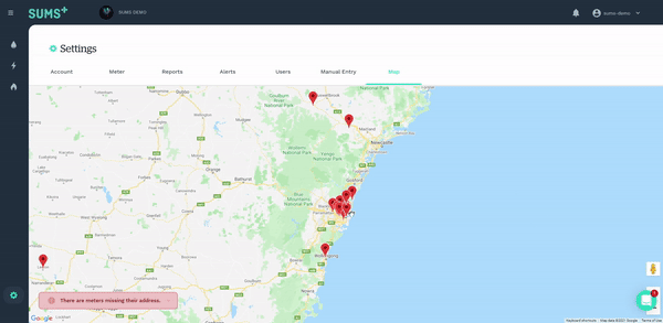 For those meters where the address is missing, the division's address will be used. An error will appear in the bottom left-hand corner of the map if there are any meters with neither address. Clicking this will bring up a list of those meters.