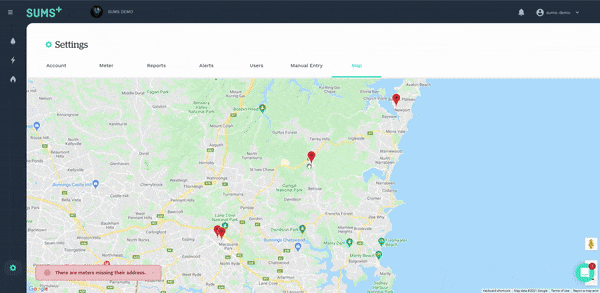 The last tab in the settings page will show a map of all meters in the enterprise or division. To go here, click the settings cog in the bottom left-hand corner of the dashboard.